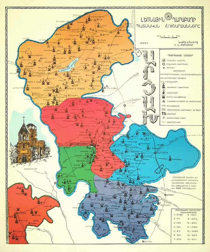 A unique map of Artsakh noting all the historical monuments located within its boundaries.
